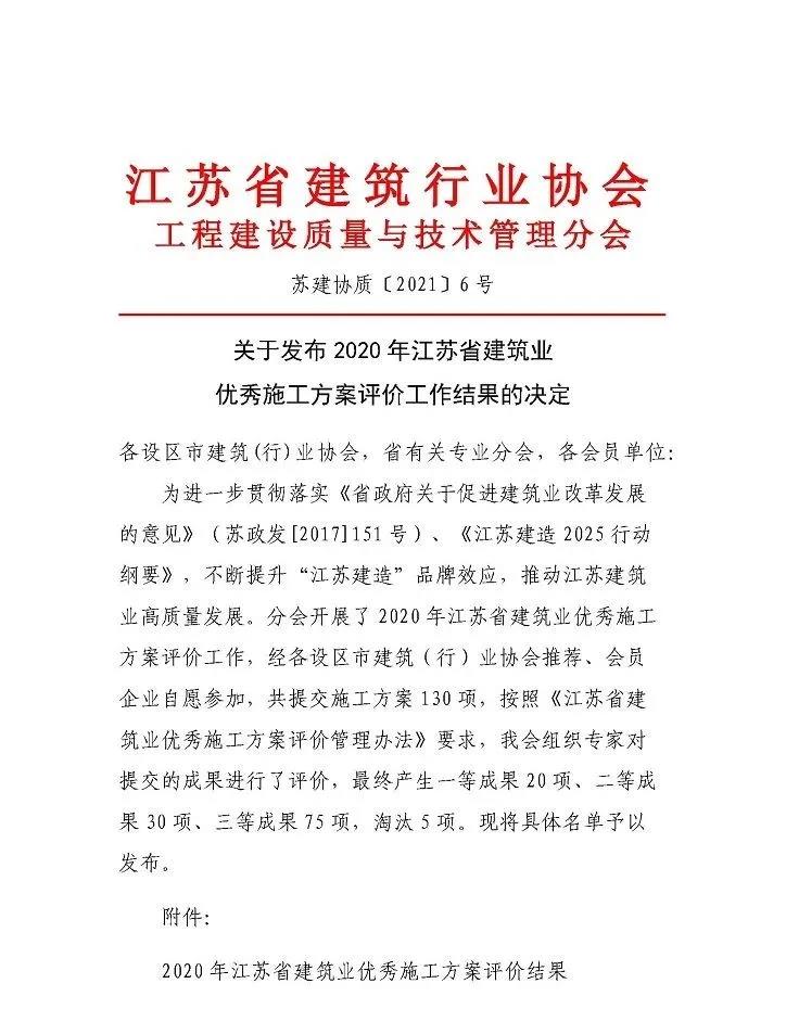近日,江蘇省建筑行業協會工程建設質量與技術管理分會發布了2020年江蘇省建筑業優秀施工方案評價工作結果的決定,集團5項施工方案獲評優秀,企業技術、管理創新再添佳績。