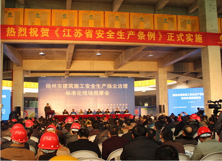 12月12日下午,揚(yáng)州市城建局在儀征寶能城市廣場(chǎng)商業(yè)綜合體工程施工現(xiàn)場(chǎng)召開(kāi)建筑施工安全生產(chǎn)揚(yáng)塵治理標(biāo)準(zhǔn)化現(xiàn)場(chǎng)觀摩會(huì)。揚(yáng)州市城建局局長(zhǎng)楊正福、副局長(zhǎng)成自勇,儀征市副市長(zhǎng)李正濤等相關(guān)領(lǐng)導(dǎo)出席會(huì)議。各縣市建設(shè)局分管負(fù)責(zé)人,全市特級(jí)、一級(jí)施工企業(yè)負(fù)責(zé)人、在建工程施工企業(yè)項(xiàng)目負(fù)責(zé)人等共500余人參加觀摩會(huì)。