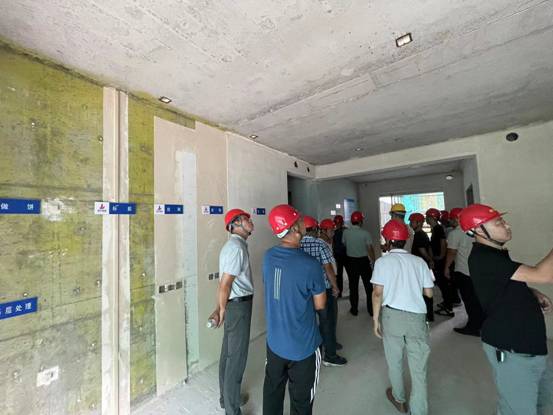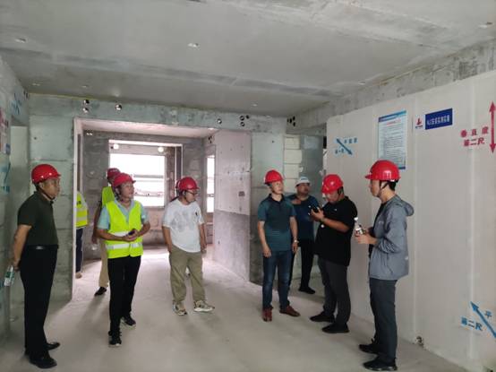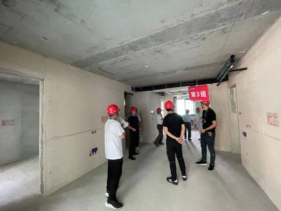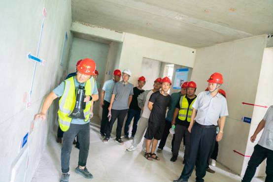 全體觀(guān)摩人員同樣分成了三組,在項(xiàng)目現(xiàn)場(chǎng)管理人員的帶領(lǐng)下深入施工場(chǎng)地,重點(diǎn)觀(guān)摩了14#樓、22#樓、26#樓粉刷施工工藝樣板、實(shí)測(cè)實(shí)量樣板;預(yù)制剪力墻、預(yù)制疊合板、預(yù)制樓梯、ALC板等施工成型質(zhì)量情況。