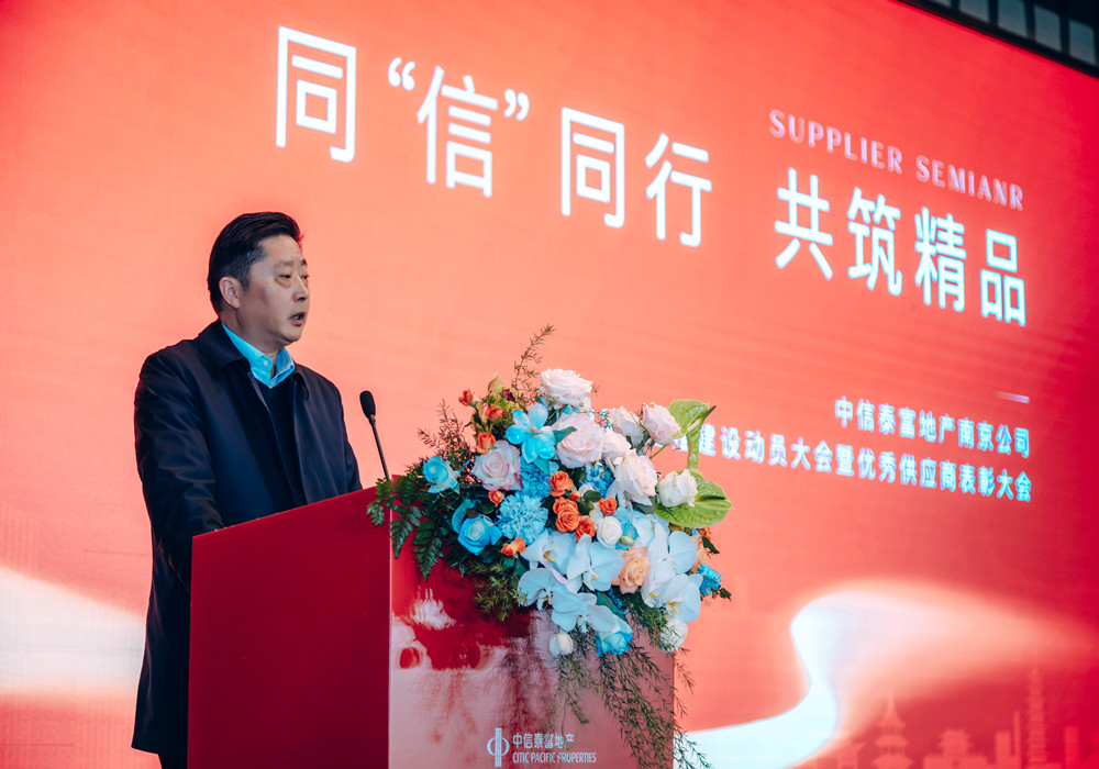 中信泰富地產杜平副總裁為大會致詞,他表示,中信泰富地產南京公司的成功離不開在座合作伙伴的辛勤付出與密切協作,希望有更多像建宇一樣優秀的供應商能與中信泰富地產保持長期合作,攜手共贏未來。王學峰副總經理介紹了中信泰富地產概況,解讀了南京公司2023年的奮斗目標。