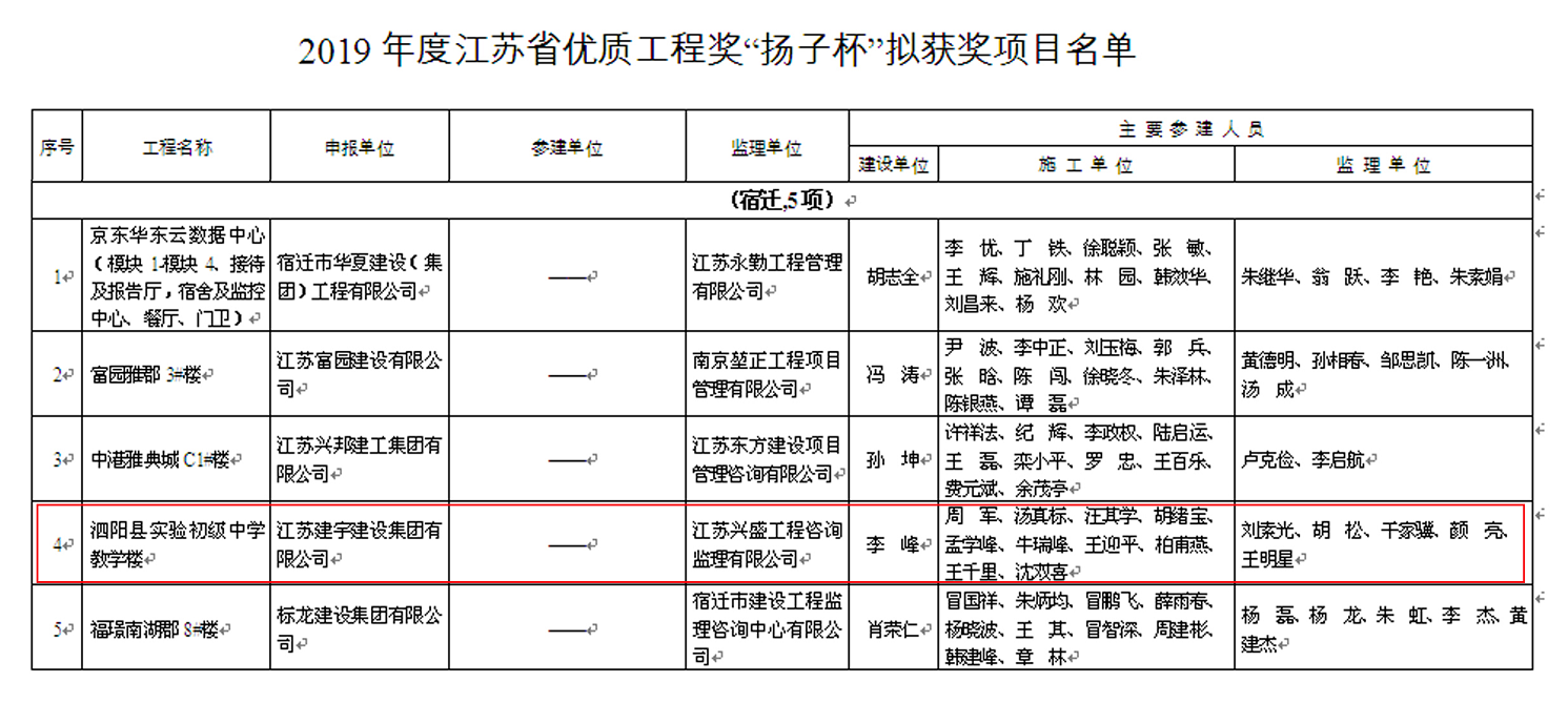 日前,2019年度江蘇省優(yōu)質(zhì)工程獎(jiǎng)“揚(yáng)子杯”公示了,由集團(tuán)宿遷分公司承建的泗陽(yáng)縣實(shí)驗(yàn)初級(jí)中學(xué)工程榮獲殊榮。