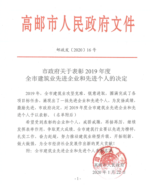 2019年我公司緊緊圍繞既定的戰略目標,面對低迷的建筑市場,團結奮進,爭先進位,各項經濟指標穩中有升,在高郵市納稅名列前茅,在揚州市納稅也取得了較好的名次。與此同時,在建筑業日趨嚴峻的形勢下,集團再次蟬聯高郵市優秀企業,也證明了企業發展理念的先導性和準確性。