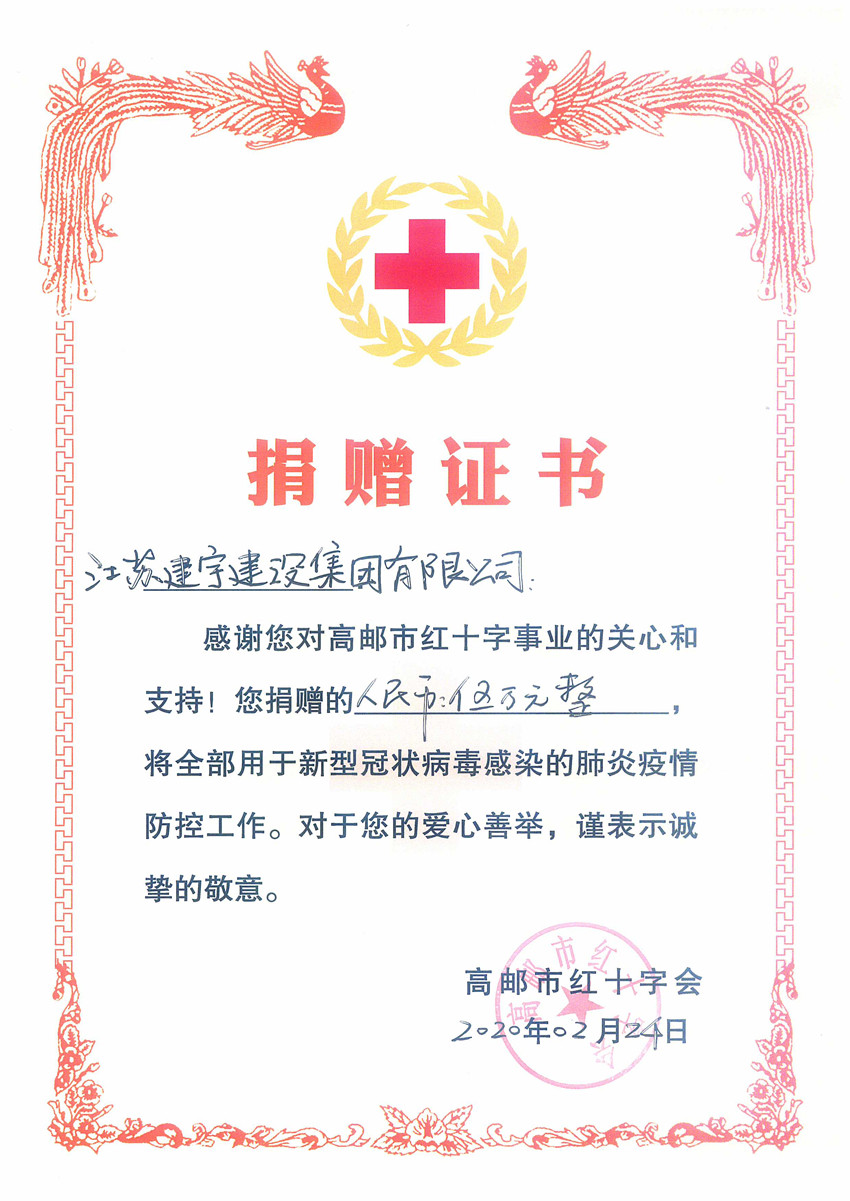 捐贈儀式上,集團董事長管民良表示,新冠肺炎疫情牽動著國人的心,建宇集團積極參與抗疫,集團旗下皇華大酒店堅守多日,為市防疫指揮部提供優(yōu)服務(wù);集團此前已通過南京市高郵商會等多途徑奉獻愛心,此次再捐贈5萬元用于抗擊新冠肺炎疫情。周鎮(zhèn)長等領(lǐng)導(dǎo)對集團的善行義舉和愛心捐贈表示真誠的感謝,并現(xiàn)場頒發(fā)愛心證書,稱贊集團此舉是作為市、鎮(zhèn)重點建筑企業(yè)勇于承擔(dān)社會責(zé)任的體現(xiàn)。