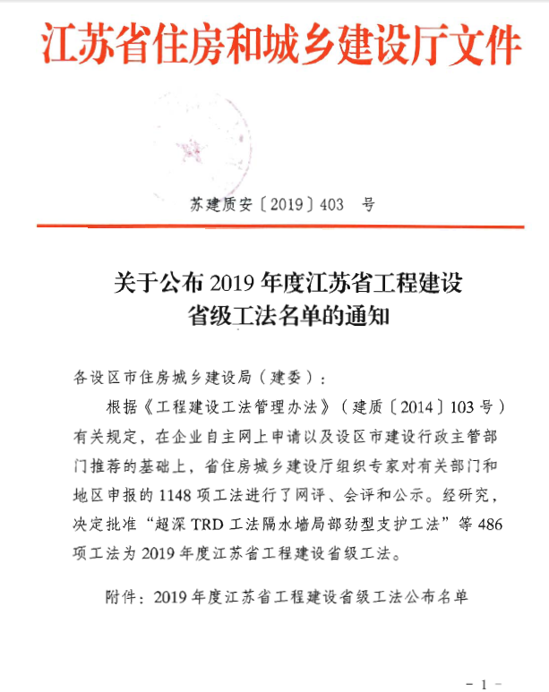 近日,從江蘇省住房城鄉(xiāng)住建廳獲悉,集團公司申報的《裝配式預制柱套管保壓停頓灌漿施工工法》、《高精度彈簧鋼與定型方鋼模板組合降板吊模支撐施工工法》、《深基坑螺旋自進式錨桿樁錨桿樁錨支護體系施工工法》、《大型勁性鋼骨柱水平滑移+龍門架吊裝施工工法》、《可調節(jié)絲牙式伸縮縫模板施工工法》五項工法技術順利通過專家網評,獲評江蘇省住房建設廳2019年度省級施工工法,企業(yè)科技創(chuàng)新再添佳績。